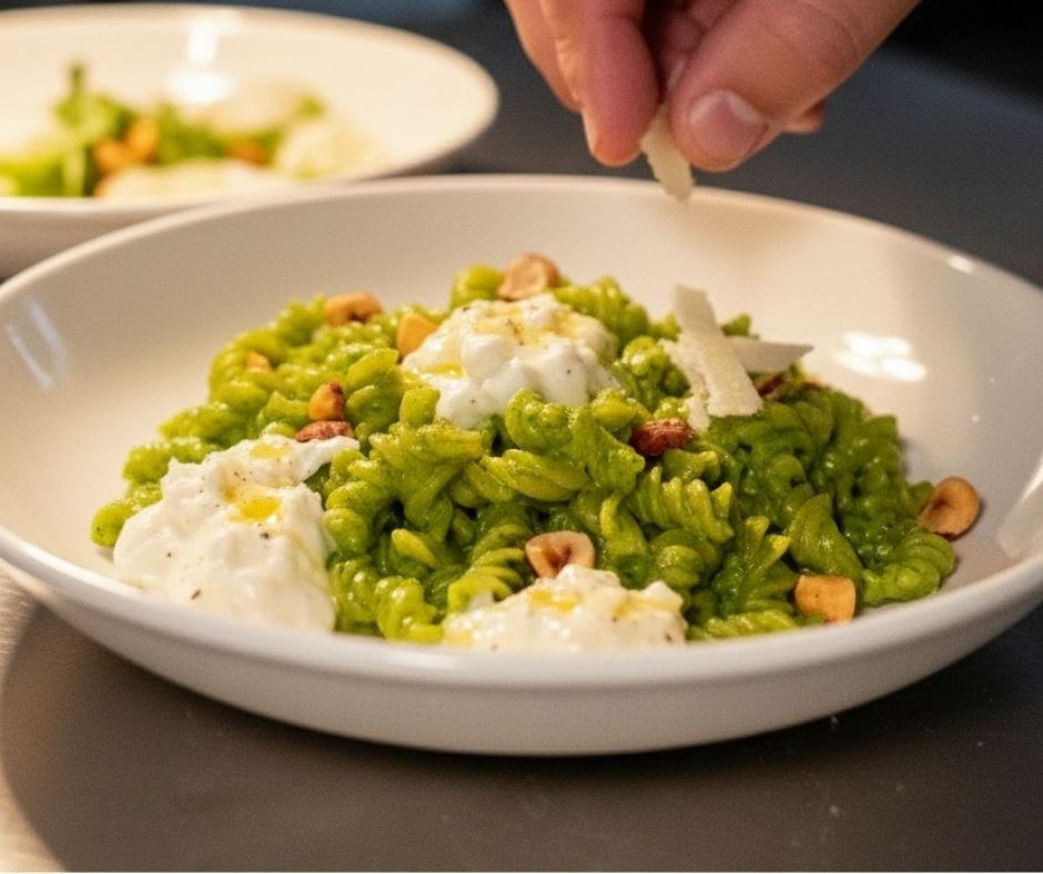 Legenda: Fusilli ao pesto do Almería: massa fresca produzida diariamente e finalizada com burrata, avelãs e ervas. O prato integra as receitas revisitadas nos testes de cozinha — onde clássicos como o pesto ganham textura, ponto e apresentação ajustados para marcar a identidade da nova fase da casa.