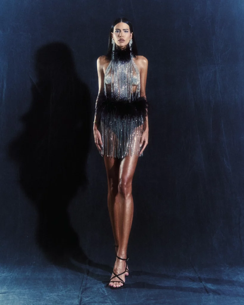 As peças, que fazem parte da coleção ‘Manifesto da Luz’, brincam com o contraste entre delicadeza e força. O primeiro se destaca pela malha de metal de aparência líquida adornada por cristais, com um aspecto fluído e resistente ao mesmo tempo. Para o segundo dia de desfiles, a artista trouxe uma combinação de plumas e cristais, acrescentando um toque glam para a composição. O conjunto, feito inteiramente de franjas de cristais, deixou o brilho como grande protagonista.