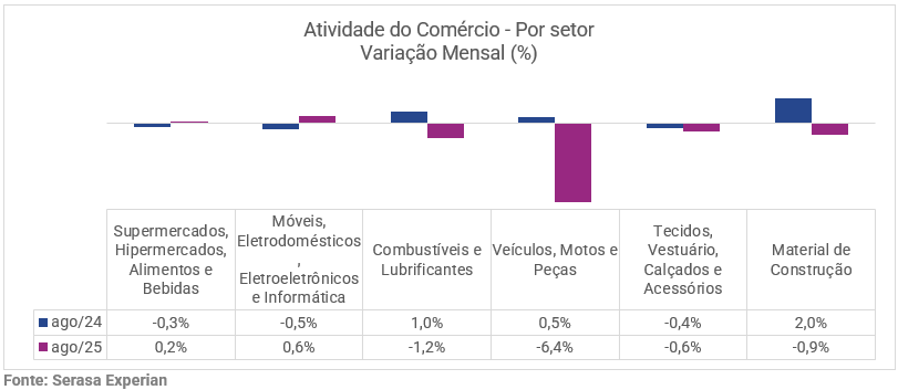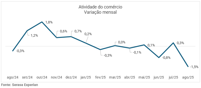 A economista da Serasa Experian, Camila Abdelmalack, analisa que “a redução é um reflexo dos juros elevados, principalmente em segmentos cujos valores de compra são mais elevados e dependem de financiamento – como os veículos. A recente melhora nos preços dos alimentos, aliada à resiliência do mercado de trabalho — com crescimento da renda real — contribuiu para a sustentação do consumo básico. Esse cenário favoreceu o desempenho do setor de Supermercados, Hipermercados, Alimentos e Bebidas com avanço de 0,2% em agosto”. Veja a variação mensal do indicador no gráfico abaixo:
