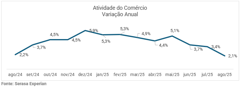 Apesar do crescimento de 2,1% na comparação entre agosto de 2025 e o mesmo mês do ano anterior, os dados apontam para uma perda de dinamismo no varejo, em meio a um cenário de consumo mais cauteloso. Essa foi a menor variação interanual registrada em 2025, que chegou a atingir 5,3% nos primeiros meses do ano.