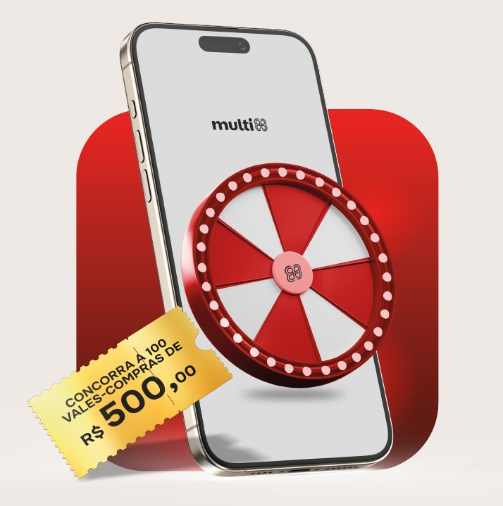 Para rodar a Roleta Premiada Black Friday basta cadastrar as notas fiscais no app Multi. R$800 em compras valem chances para ser presenteado com os 100 Cartões Vales-Compras de R$500: