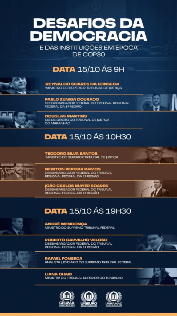 Ministros do Supremo Tribunal Federal (STF), Superior Tribunal de Justiça (STJ), Tribunal Superior do Trabalho (TST), desembargadores, juízes e professores estarão reunidos em Brasília no dia 15 de outubro para debater os ‘Desafios da Democracia e das Instituições em Época de COP30. O encontro jurídico-acadêmico, promovido pelo Grupo Ceuma, será realizado no Centro Universitário Unieuro, às 9h, na Biblioteca da Unidade Águas Claras.