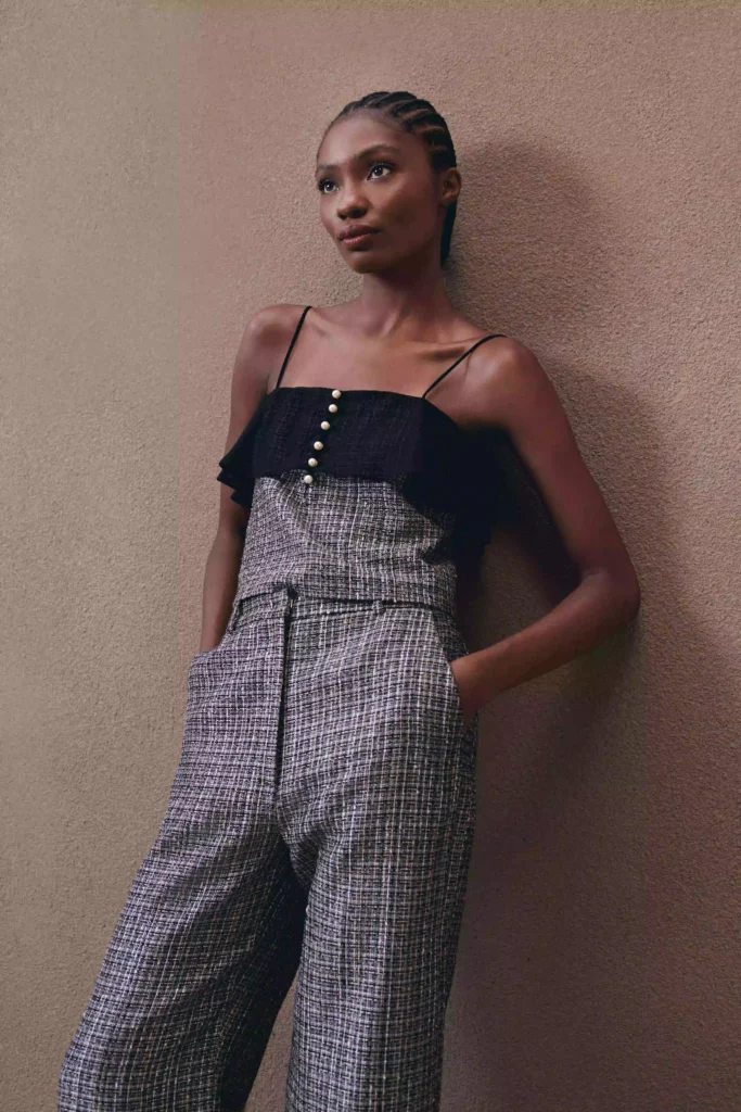 Entre as modelagens, a silhueta balloon ganha protagonismo em peças como a calça Dominique e a família Nephele, enquanto a modelagem cenoura e as referências ao trench coat aparecem na família Matteo e no conjunto Ramona, em jeans black lavado. O conforto surge como elemento central na família Matilde, em malha estruturada, e na linha Rossi, confeccionada em crepe de acetato com viscose e acabamentos em metal dourado.
