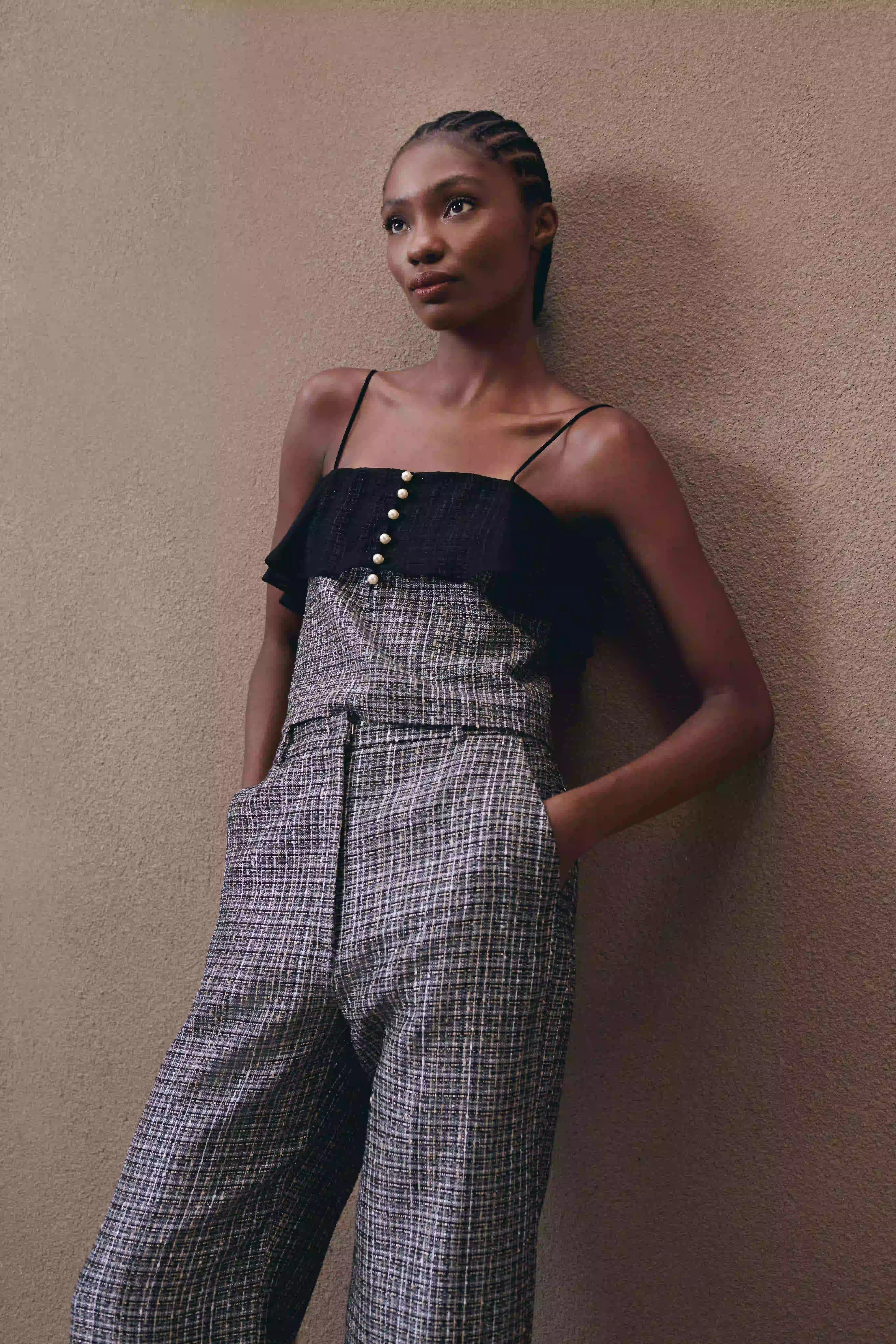 Para a noite, a coleção traz o vestido Loretta, que explora o brilho sutil do tecido creponado e fendas estratégicas. Já o poá, uma das estampas mais emblemáticas da herança da marca, retorna na família Verena em vestidos pregueados e tops drapeados com laços. A família Gimma acrescenta leveza romântica com tweed leve e botões de pérola.