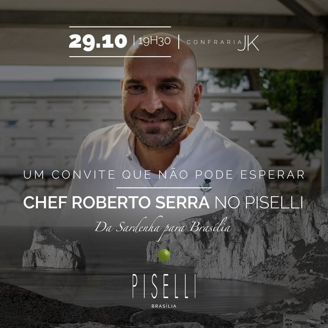 O Piselli Brasília recebe no dia 29 de outubro, às 19h30, uma das maiores referências da culinária sarda: o chef Roberto Serra, comandante do renomado restaurante Su Carduleu, na Sardenha. A casa ostenta 2 garfos do guia Gambero Rosso e uma cobiçada indicação Bib Gourmand do Guia Michelin.