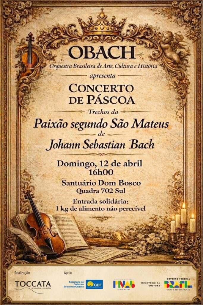 A Orquestra Brasileira de Arte, Cultura e História (OBACH) realiza, no próximo 12 de abril, uma apresentação especial de Páscoa no Santuário Dom Bosco, em Brasília, com trechos da célebre Paixão segundo São Mateus, de Johann Sebastian Bach. A proposta é transformar o concerto em uma experiência que articula música sacra, contemplação e patrimônio, em um dos espaços mais emblemáticos da capital. A entrada é gratuita, com sugestão de doação de 1 quilo de alimento não perecível, destinado a instituições de caridade.