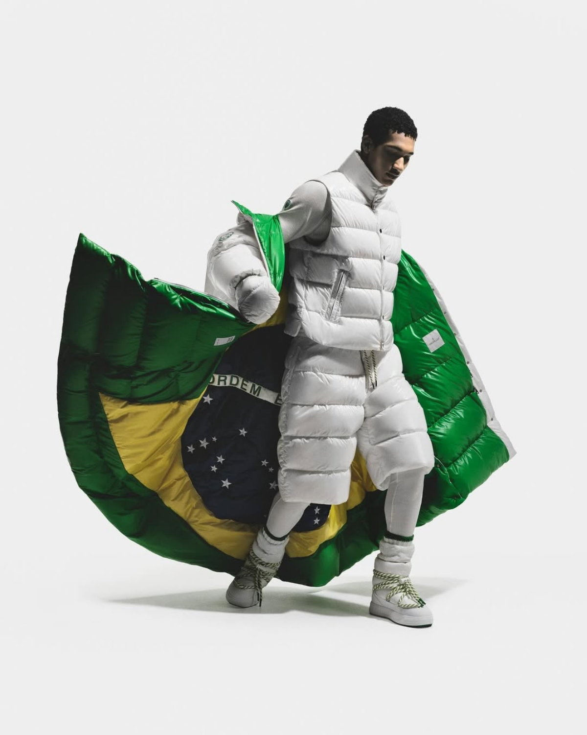 Na colaboração com a Moncler, essa visão se reflete em um visual limpo, técnico e funcional. Os porta-bandeiras Lucas Pinheiro Braathen e Nicole Silveira entraram na cerimônia com capas longas brancas, confeccionadas em nylon reciclado, com modelagem oversized que se estende até os tornozelos. A bandeira brasileira aparece de forma sutil, escondida no forro das peças.