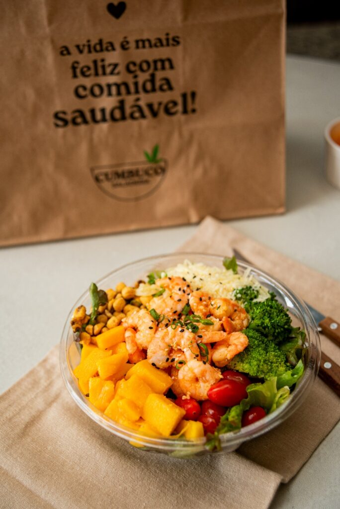 Já na Cumbuco Saladeria, a aposta são saladas que combinam folhas, proteínas e molhos autorais. A Salada Verde (a partir de R$ 39,90) reúne mix de folhas, brócolis, pepino, queijo gorgonzola, amêndoas caramelizadas e molho de mostarda e mel. A Salada Camarão (a partir de R$ 48,90) leva alface americana, camarões, parmesão, croutons e molho caesar. Outra opção é a Salada Salmão (a partir de R$ 45,90), com mix de folhas, tomate sweet, edamame, palmito, salmão grelhado, couve crispy e molho oriental.