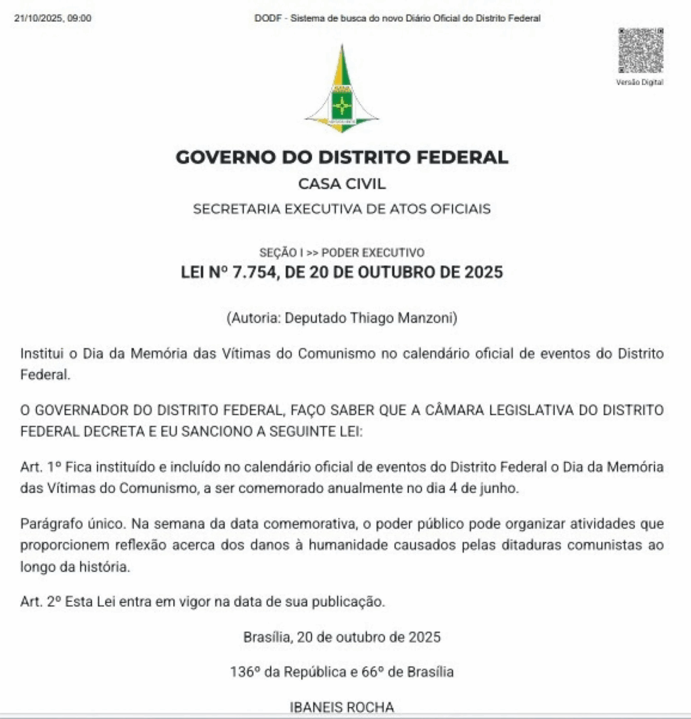 O governador do Distrito Federal, Ibaneis Rocha (MDB), sancionou a lei que institui o “Dia da Memória das Vítimas do Comunismo” no calendário oficial de eventos do DF. A data será comemorada anualmente em 4 de junho, conforme publicação no Diário Oficial desta segunda-feira (20/10).