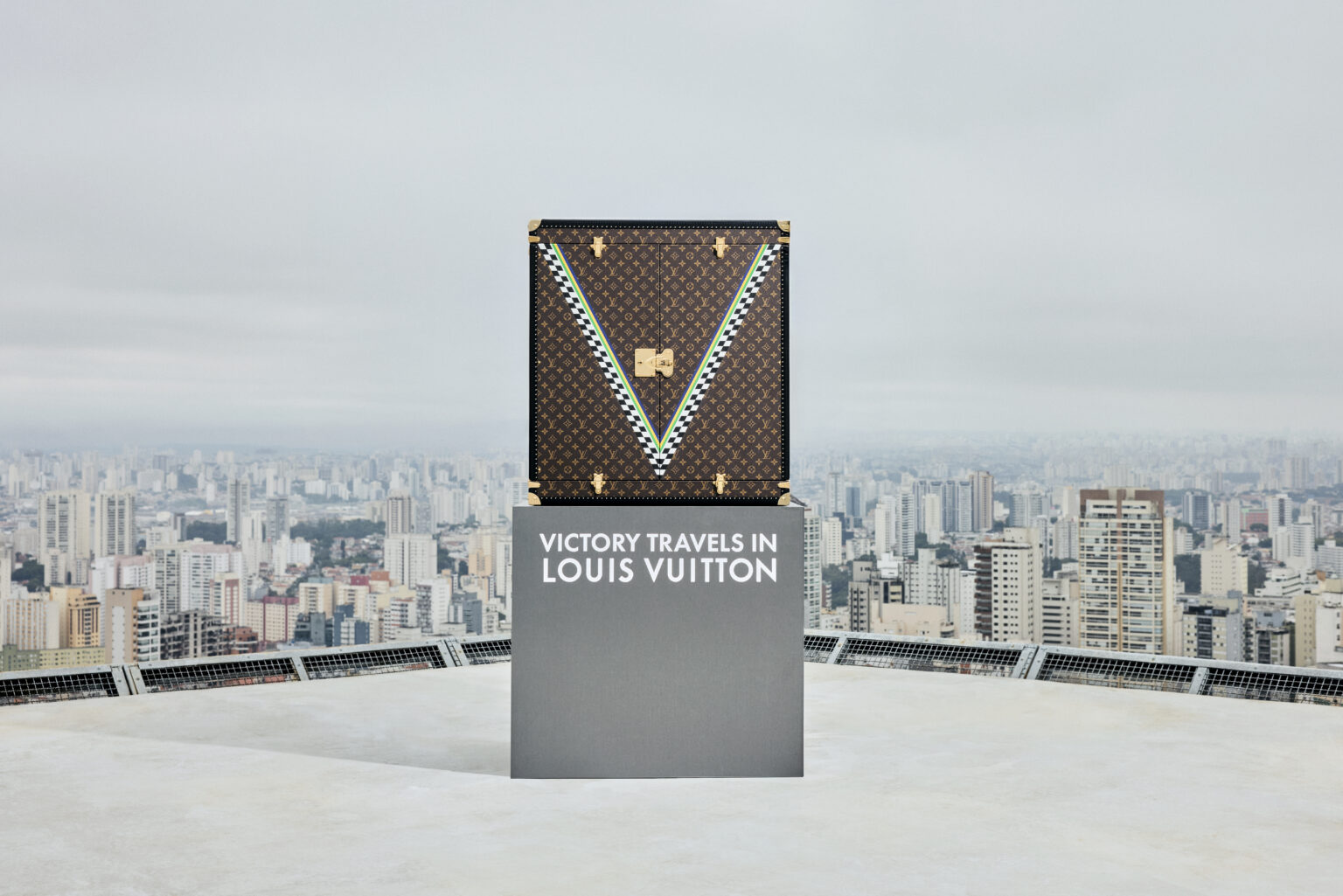 No centro da composição, o destaque é a letra “V”, que simboliza tanto “Vuitton” quanto “Vitória” — um toque que reforça o lema da campanha da marca: “A vitória viaja em Louis Vuitton”.
