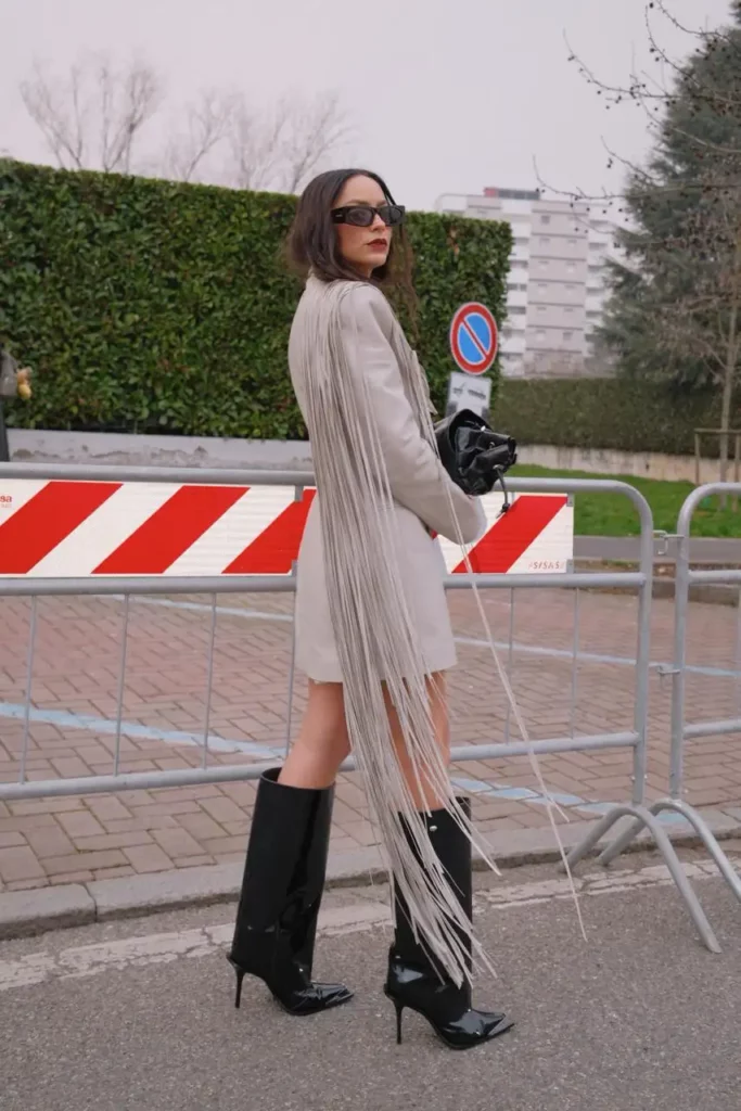 Para o primeiro dia de Fashion Week, a influencer esteve na front row do desfile de primavera/verão da Diesel, por Glenn Martens, com um conjunto em couro de saia e blazer adornado com franjas. Completando o look, Lu apostou em botas e bolsa com acabamento vinílico preto.