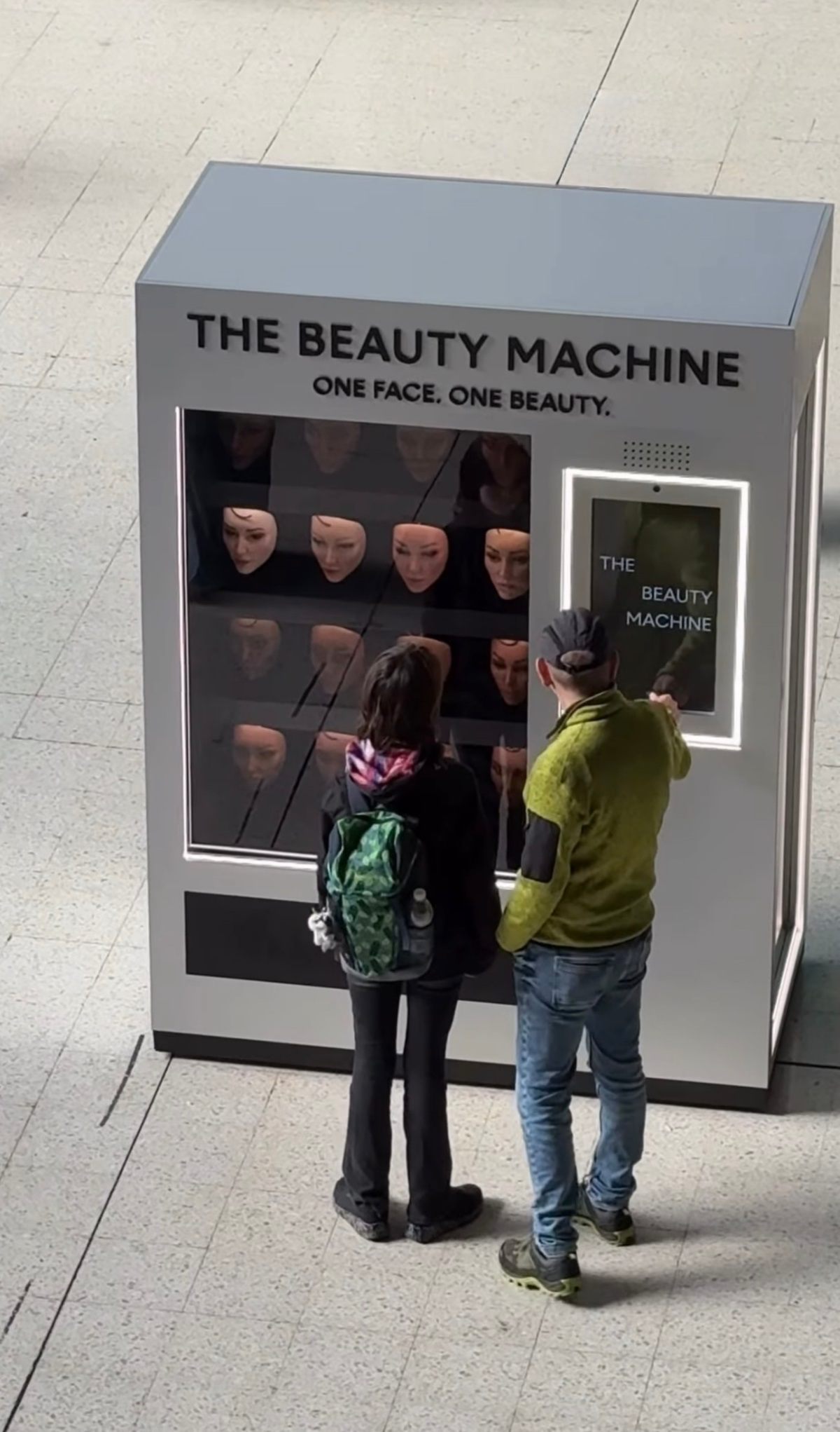 Batizada de The Beauty Machine, a instalação materializa uma crítica direta ao funcionamento dos algoritmos das redes sociais. A promessa de diversidade dá lugar, na prática, à repetição. Muda o feed, muda o filtro, muda a plataforma — mas o padrão de beleza continua quase sempre o mesmo.