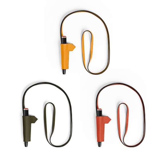 Colar com Porta-Canetas, confeccionado em couro Sartorial nas cores tangerine, khaki e saffron, pode ser usado ao redor do pescoço ou preso a cintos e bolsas, mantendo os instrumentos de escrita sempre à mão.