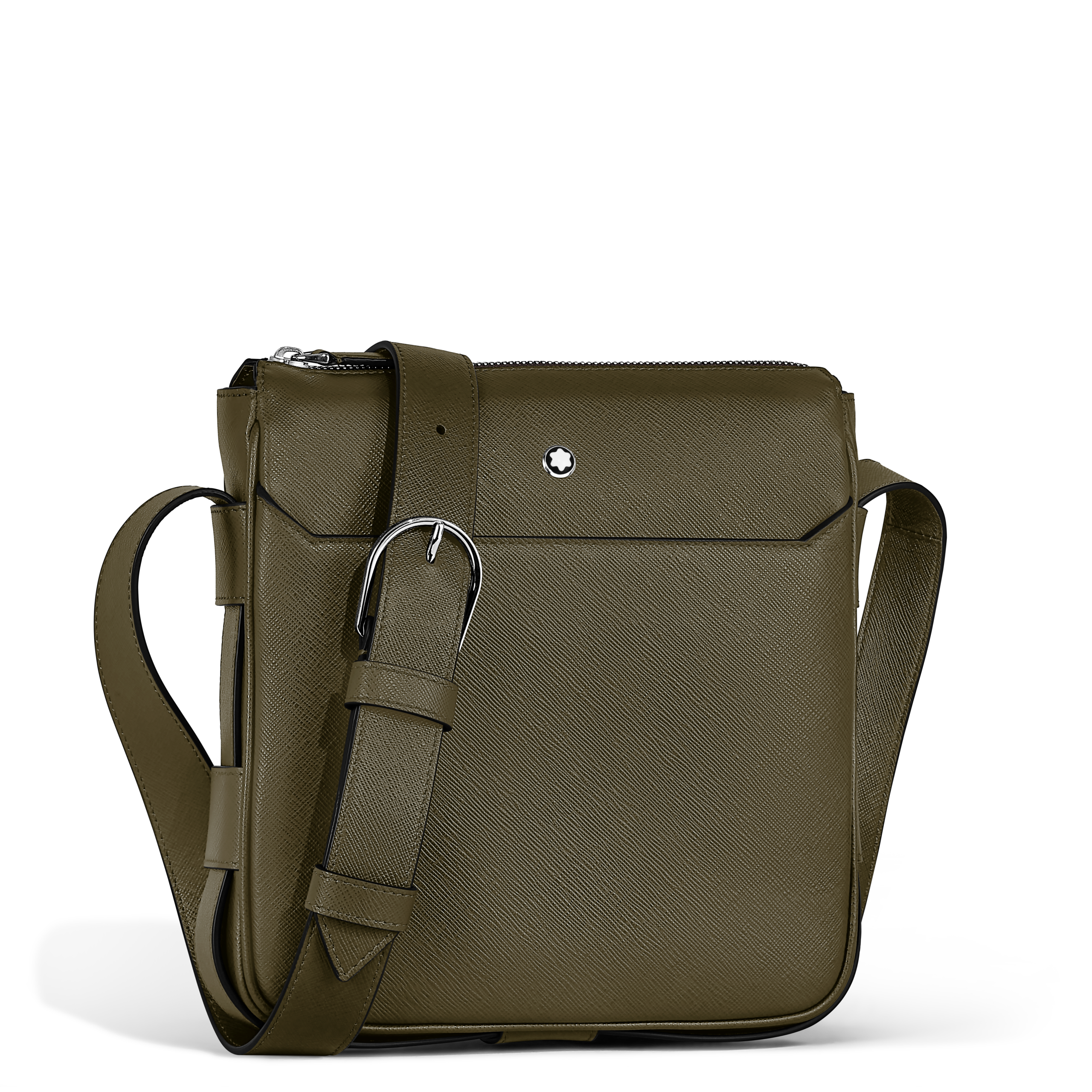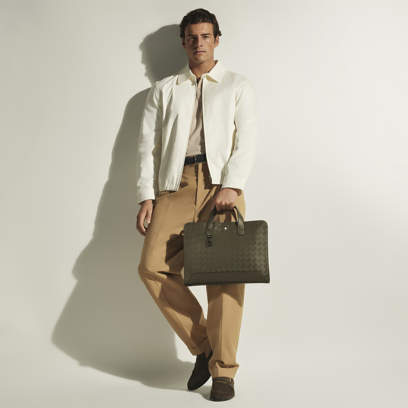 O couro Extreme, marca registrada da Montblanc, com seu motivo geométrico inspirado na Bauhaus e durabilidade sinônimo de vida em movimento, é reinterpretado em um tom khaki terroso para modelos como a Pasta Sling e a On-Body Bag de uso transversal.