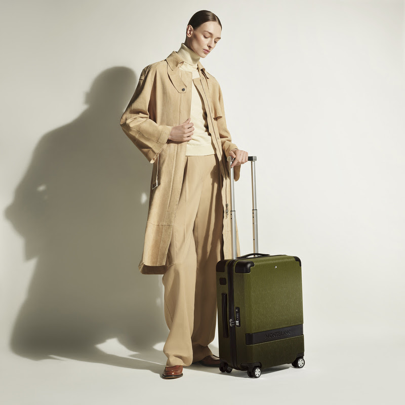 A espaçosa bolsa de viagem Weekender surge no tecido Jacquard 4810 da Montblanc, inspirado nos arquivos da marca, com detalhes em couro na cor fauve, O tom velvet green adorna a mala de cabine #MY4810. Variando do escuro para o claro em cada peça de couro que reveste, o acabamento degradê suave do efeito sfumato ecoa a delicada saturação da tinta no papel.
