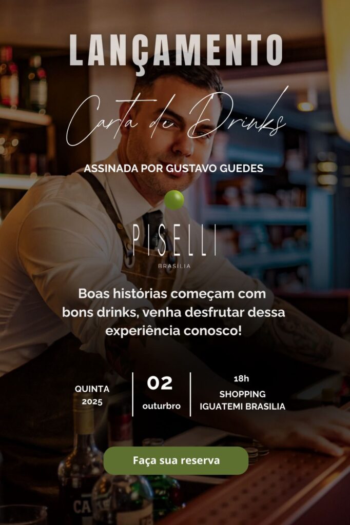 Piselli Brasília promove, na quinta-feira, 2 de outubro, uma noite dedicada à coquetelaria: o lançamento da nova carta de drinks, criada pelo premiado mixologista Gustavo Guedes. Para marcar a estreia, a casa preparou uma recepção exclusiva, com piano ao vivo e harmonizações que unem os coquetéis autorais à gastronomia italiana que consagrou o restaurante.