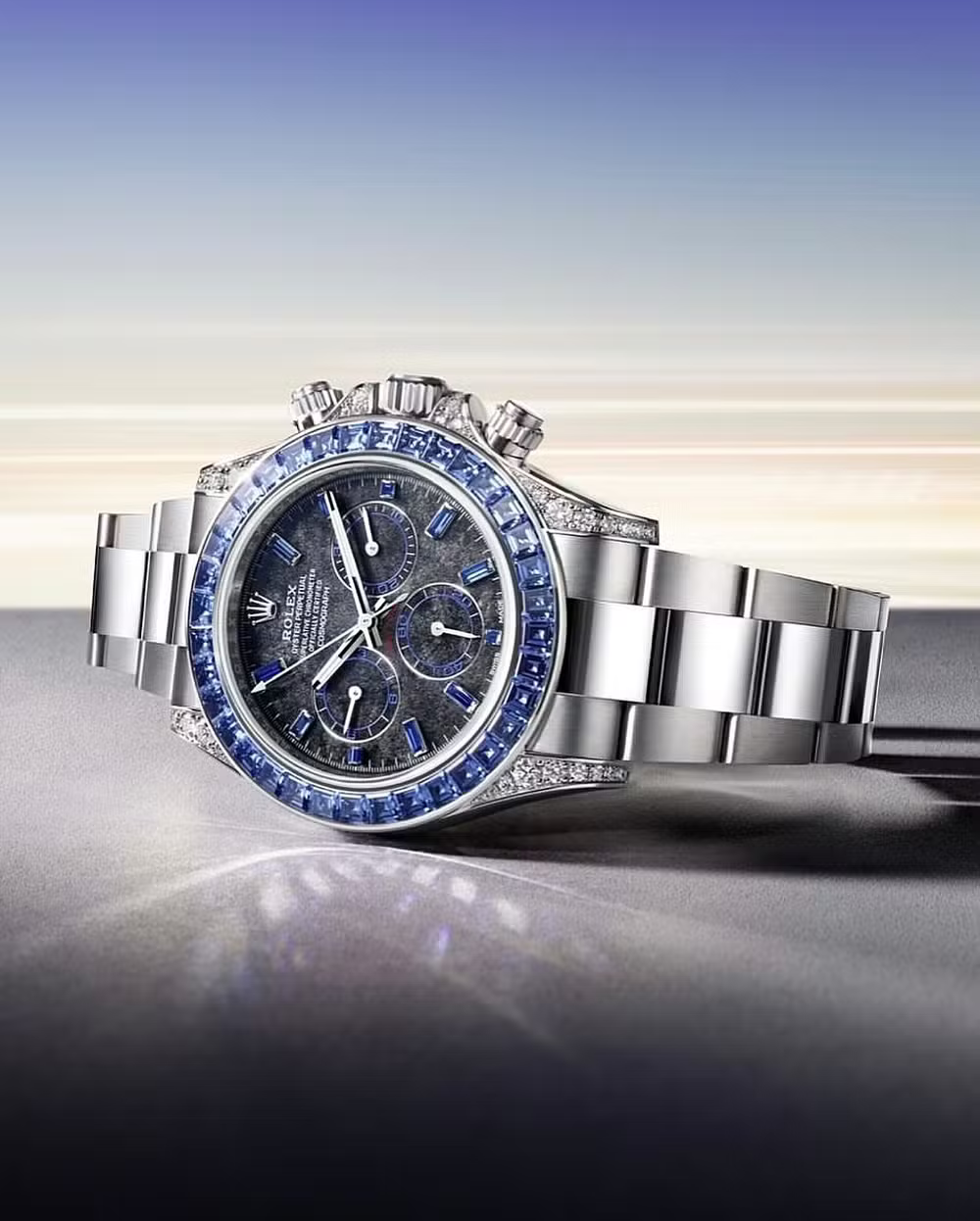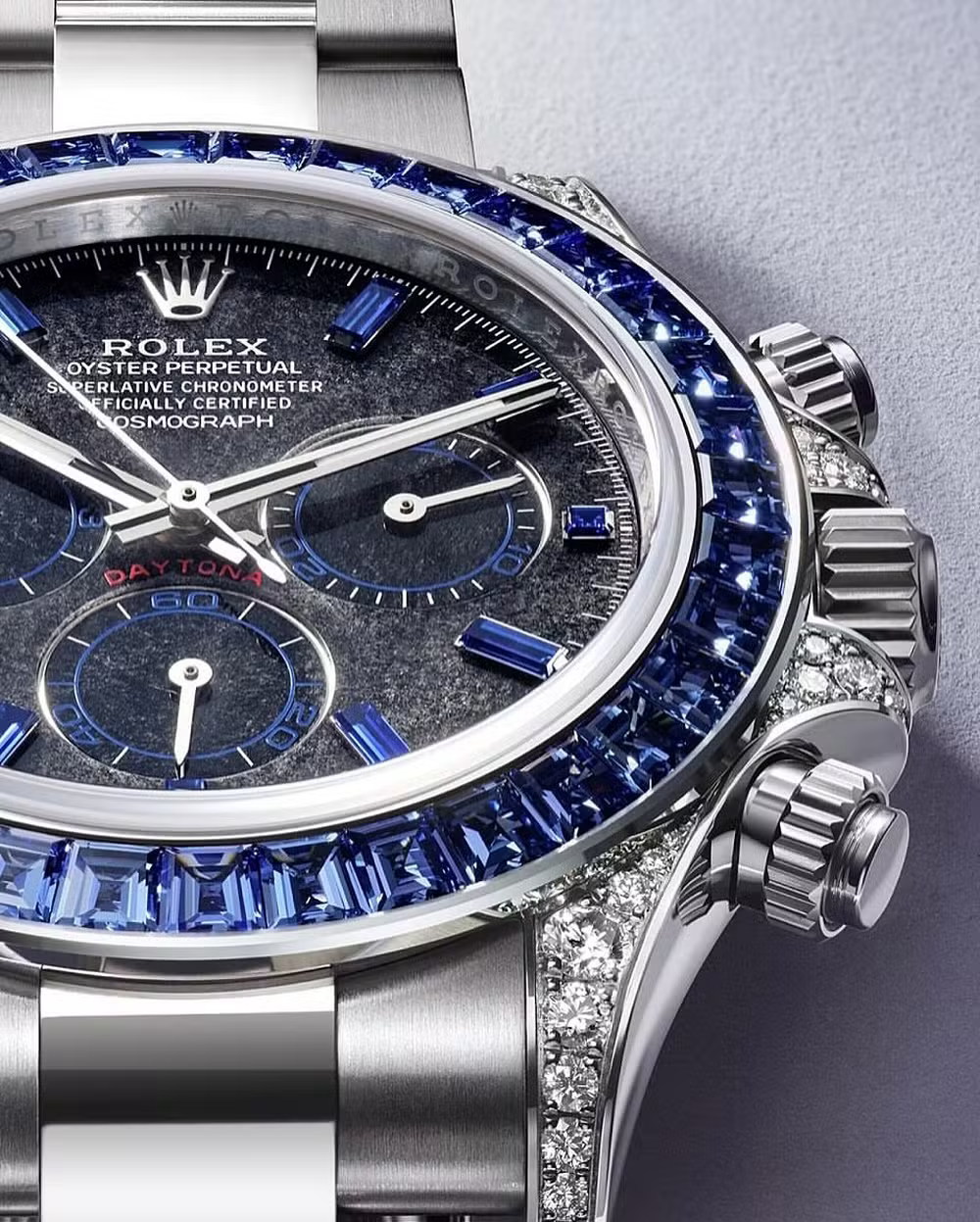O modelo em questão é o Rolex Daytona “Blue Sapphire”, uma joia da relojoaria de luxo. Feito em ouro branco 18k, com mostrador de ônix e aro cravejado com 36 safiras azuis baguete, o relógio está entre os mais raros e exclusivos da marca. Com pouquíssimas unidades disponíveis no mundo, o Daytona só pode ser adquirido por meio do mercado cinza, com preços que ultrapassam os US$ 1,5 milhão.