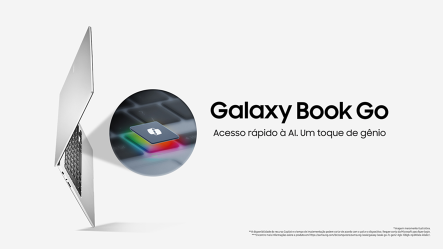 Já o Galaxy Book Go agora conta com a tecla Copilot1, oferecendo acesso facilitado aos recursos de AI para transformar a experiência do usuário e, consequentemente, tornando as tarefas diárias mais rápidas, inteligentes e eficientes. Já conhecido por diferenciais como mobilidade, autonomia de bateria e desempenho para atividades de rotina, o Galaxy Book Go oferece funcionalidades que otimizam a experiência de navegação, facilitam processos e oferecem até sugestões de melhorias em textos e apresentações.