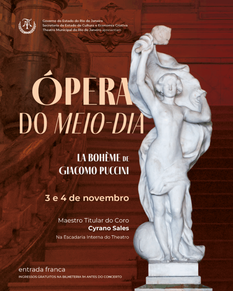 A Ópera do Meio-Dia ocupa, mais uma vez, a escadaria interna do Theatro Municipal do Rio de Janeiro com uma das mais populares óperas do mundo: La Bohème, de Giacomo Puccini. E de graça. Com uma equipe premiada, as apresentações acontecerão nos dias 3, 4, 17 e 18 de novembro, às 12h, com ingressos distribuídos uma hora antes do início do espetáculo, na entrada principal do Municipal.